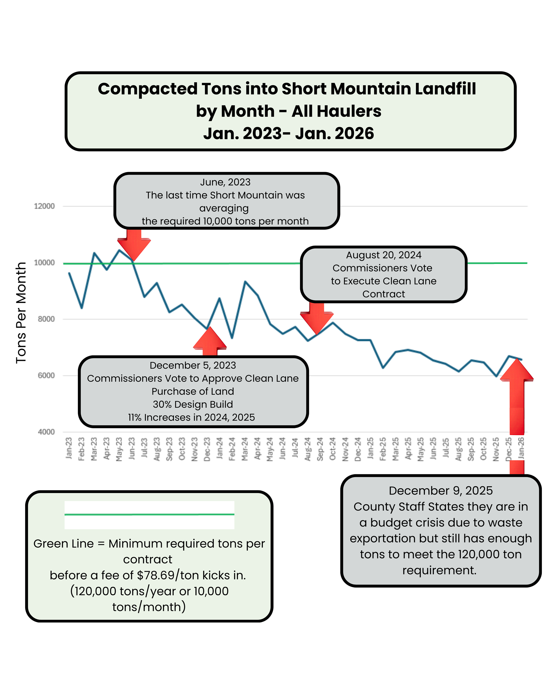 The contract between Lane County and Bulk Handling Systems shell LLC “BHS PROJECTS @ LANE COUNTY LLC” was signed in October 2024. That contract details the agreement between the two parties. One of those details was that Lane County is required to deliver 120,000 tons annually (or 10,000 a month) of acceptable materials to CleanLane as described on page 23 of the contract: